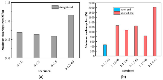 where σf is the pullout stress of the SMA fiber; F is the pullout load; Af is the section area of the SMA fiber; df is the diameter of the SMA fiber. The comparison of the maximum pullout stress of the SMA fiber in each specimen is shown in Figure 10.