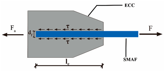 As for SMA fibers with hook end and knotted end, the bond strength mainly comes from the anchoring force Fa. With the increase of the pullout load, the interface between SMA fiber and ECC matrix begins to debond, and the debonding area develops from the loading end to the fiber end. When the interface along the bonding length is completely debonded, the pullout load is mainly resisted by the anchoring force of the fiber end. Therefore, in the ultimate state of bearing capacity, the maximum pullout load can be expressed as in Equation (4).