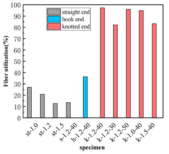 where fy is the tensile strength of the SMA fiber. When uf is greater than 100%, it represents that the fiber has been fractured [43]. The SMA strength utilization rate of each specimen is shown in Table 6, and the comparison figure is shown in Figure 13.