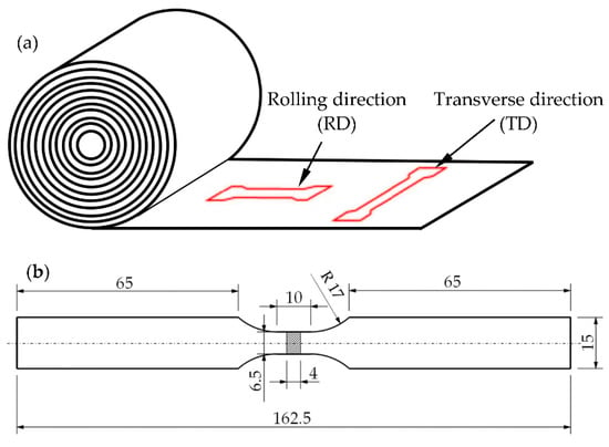 The flat tensile specimen shown in Figure 2a, taken from one batch of material, was used in the uniaxial quasi-static tensile tests and high-cycle fatigue (HCF) tests. All the specimens were fabricated using the abrasive water jet (AWJ) cutting technology from a 4 mm thick sheet. The specimens were fabricated in the rolling direction (RD) and transverse direction (TD); see Figure 2b.