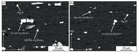 Figure 3 shows the backscattered electron images of the investigated alloy in its as-received condition for both orientations (in the rolling and transverse directions). The alloy is composed of an Al-rich solid solution, alpha-Al, dark Mg2Si particles, large bright iron-rich Al6(Fe, Mn) particles, and smaller plate-like Mn-rich Al6(Fe, Mn) particles. The particles were identified using EDS. A detailed investigation of particles was carried out in our previous publication [33], and the results were consistent with the findings of Liu et al. [13]. The microstructures in both sections are very similar; however, the dimensions of Fe-rich Al6(Fe, Mn) particles are longer in the direction of rolling.