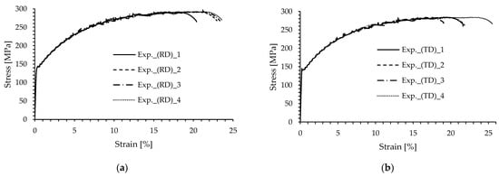 Engineering stress–strain curves of the AA 5083-H111 alloy. (a) Rolling direction (RD). (b) Transverse direction (TD).