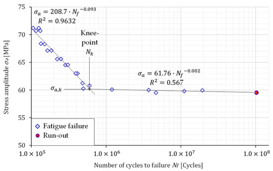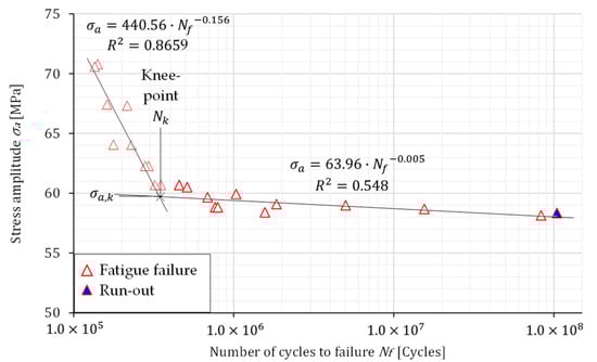 The high-cycle fatigue (HCF) tests were performed in a force control under pulsating loading (load ratio R = 0.1) at a constant frequency of 66 Hz. Eight loading levels were selected, to obtain the S–N curves for both specimens’ layouts. The S–N curves presented in Figure 6 and Figure 7 were defined by plotting the stress amplitude σa versus the number of cycles to failure Nf. Some scatter of the experimental results presented in Figure 6 and Figure 7 is evident for both specimens’ layouts. However, the scatter is greater for the transverse direction. Furthermore, the S–N curves are “bilinear” and consist of two linear curves with different slopes, which intersect at the knee point Nk [36]. The fatigue behaviour below and upper the knee point Nk can be expressed as follows: