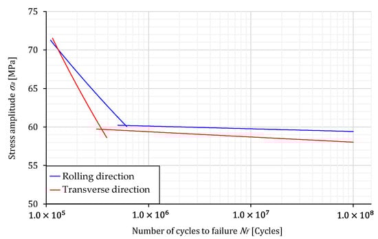 - In the proposed research work, we analysed only two specimen orientations: (i) in the rolling direction and (ii) transverse to the rolling direction. The third specimen orientation (45° in regard to the rolling direction) could be investigated in our further research work. Furthermore, further research work should consider the higher number of experiments, especially in the long-life fatigue area (more than 107 loading cycles). In this case, a comprehensive statistical evaluation could be performed to obtain more qualitative results regarding the fatigue behaviour of the analysed aluminium alloy.