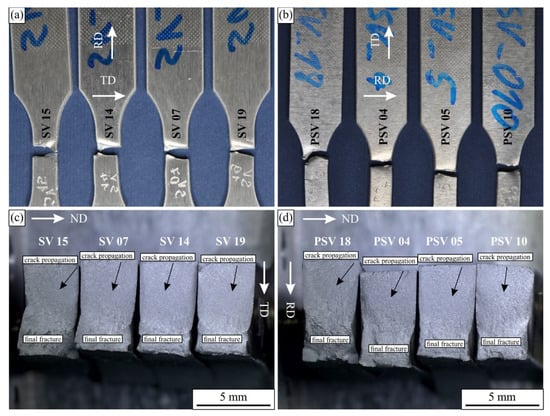 The light micrographs of the fractured surfaces of the selected fatigue samples: (a,c) longitudinal layout and (b,d) transverse layout (ND—normal direction, RD—rolling direction, TD—transverse direction).