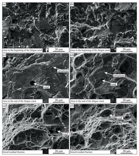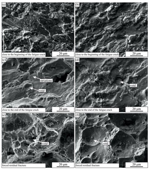 In the last stages of the crack propagation, the surface was rather rough, and it was not perpendicular to the loading direction. The distances between striations increased and were typically between 2 and 4 μm. In these regions, not only striations were present, but also some voids. The voids formed at larger inclusions in the microstructure. They formed in the regions in front of the fatigue crack as the stresses surpassed the yield stress of the material, and they grew until the main fatigue crack overtook them. The final forced residual fracture was almost the same as the tensile fracture (see Figure 3) and consisted of voids of different sizes.