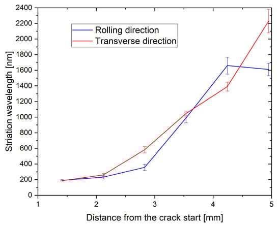 Striation wavelength in dependence from the crack start (RD—sample, TD—sample).