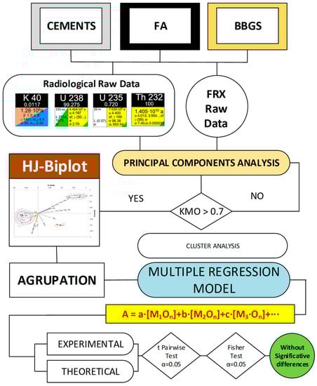 Based on the results of the chemical analysis of the samples and the activity concentration data of the radionuclides, a statistical study was carried out in order to obtain the models relating to both sets of results. The study was performed using the Real Statistics Resource Pack, Release 7.6 software (www.real-statistics.com; accessed on 1 August 2022) [] and was carried out separately for the three sample types: cement, FA and slag. The diagram showing the statistical process followed in this study is presented in Figure 1.