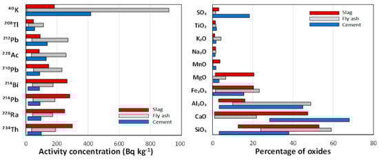 Gamma spectrometry was determined in a previous study [] for the same 12 cements, 11 ashes and 5 slags as those listed in Section 2.2.