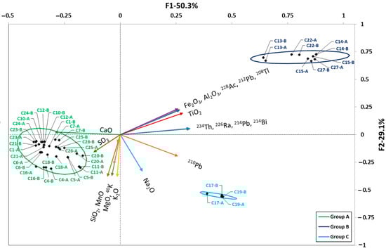 The second set included the CACs (samples C13–C15, C22 and C27) with a higher concentration of natural radionuclide activity and higher Fe2O3, Al2O3, and TiO2 content (dark blue group).