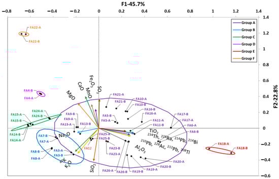 Figure 4 shows the HJ–Biplot relating the chemical compositions of the FA samples to the activity concentrations of radionuclides belonging to the natural radioactive series of uranium and thorium together with 40K. The two factors found in the FA accounted for 67.6% of the variance of the analyzed samples. The KMO fitness index was 0.709, reaching an acceptable level of correlation between the sampled values. The first factor represented the amount of TiO2, Al2O3, Na2O, and radionuclides from the uranium and thorium radioactive series, explaining 45.7% of the variance. The second factor represented Fe2O3, SO3, MnO, CaO, MgO, SiO2, K2O, and 40K, explaining 22.8% of the variance. The scores obtained for the FA samples indicated a high dispersion as (i) they were distributed in the four quadrants and were close to the origin of the axes and (ii) six groups of samples were formed, three of which are very close to each other.