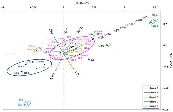 Factor 1, which represented 46.5% of the variance, was related to the natural radionuclide content (uranium and thorium series together with 40K), K2O, and Na2O. Factor 2, which represented 21.1% of the variance, was related to the Al2O3, TiO2, CaO, MgO, and SiO2 content. The clusters obtained in the sample scores indicated a low correlation with the factors found, as they were centered around the origin of the coordinates.