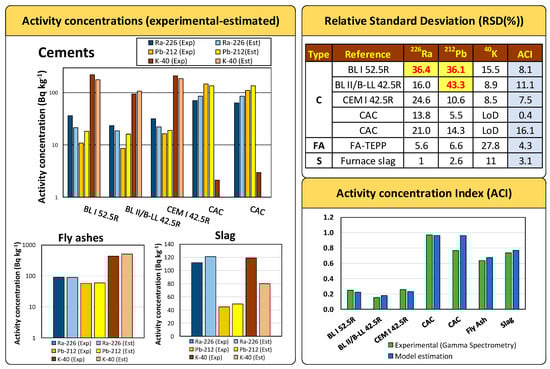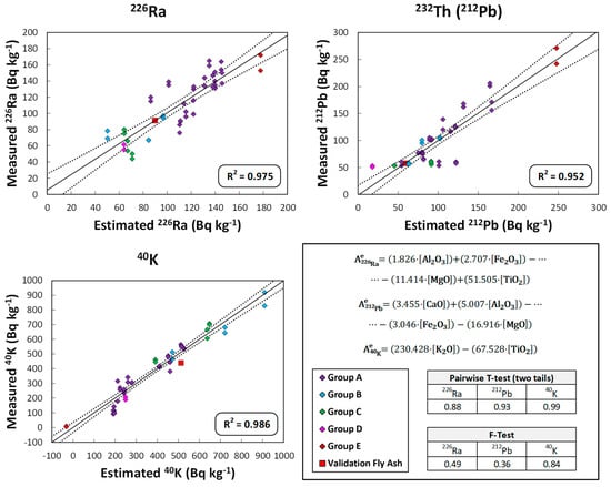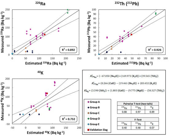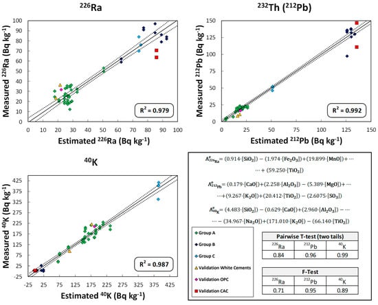 The activity concentrations of 226Ra, 232Th(212Pb), and 40K obtained using the proposed models with the chemical compositions were compared with the experimental values of the cements, FA and slag using Student’s t-test of paired results for a significance level α = 0.05.