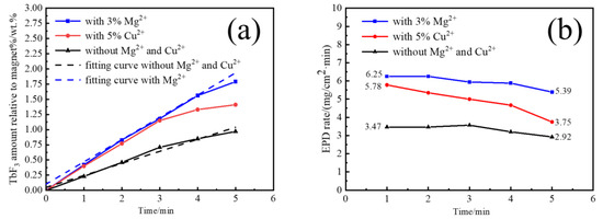 The EPD behavior with different time was studied by adding the best relative content of Mg2+ and Cu2+. Figure 2 shows the EPD TbF3 amount (a) and EPD rate (b) of nano-TbF3 at different times. It can be seen in Figure 2a that the amounts of EPD all increased linearly with time when EPD was measured from the beginning to three minutes, which is consistent with the fact that the amount of EPD TbF3 amount is proportional to the time in the EPD theory. It is also found in Figure 2b that the EPD rate reduced when the EPD time reached 4–5 min because the deposited EPD coating increases the resistance. However, the EPD rate with Cu2+ reduced more than that of the others, which indicates that some changes occur to reduce the EPD efficiency when adding Cu2+ to the EPD suspension. Relatedly, adding Mg2+ will not affect the EPD process.