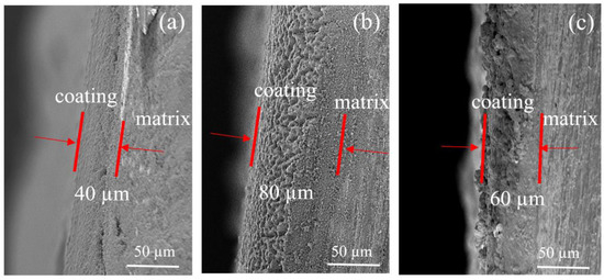 Figure 3 shows the cross-sectional SEM morphologies of the EPD 90s coated magnet. It can be seen in Figure 3a that the thickness of the coating was about 40 μm. However, Figure 3b,c shows that the thickness increased to about 80 μm with 3% Mg2+ added and increased to 60 μm with 5% Cu2+ added. This also proves that the addition of Mg2+ and Cu2+ improves the EPD efficiency.