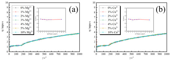 Viscosity of the EPD suspension with different Mg2+ and Cu2+ relative content changes with shear rate (inset is the average viscosity with different Mg2+ and Cu2+ relative content). (a) with Mg2+ (b) with Cu2+.