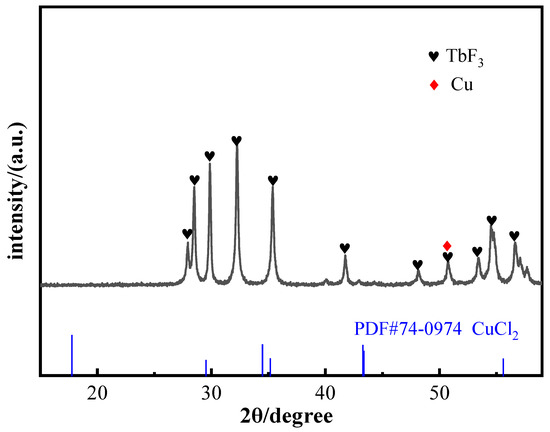 This process reduces the EPD rate because of consuming Cu2+ and reducing the content of positive charge in the EPD suspension. Additionally, the process of generating Cu is not conducive to the deposition of TbF3 on the surface of the magnet. This is also the reason for the uneven coating surface in Figure 3c.