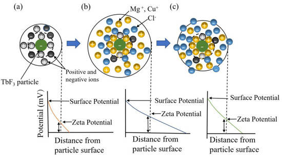According to the diffusion double layer theory [26], Mg2+ and Cu2+ affect the zeta potential of the EPD suspension by adsorption. Figure 7 shows a schematic of the diffusion electric double layer region of a TbF3 particle. It can be seen in Figure 7a that when no charging agents are added, the particle surface mainly absorbs the positive and negative ions produced by dissociation in suspension. It can be seen in Figure 7b that when the relative content of Mg2+ and Cu2+ was low, the surface charge of the ion was gradually saturated. The diffusion double layer gradually became thicker with the increase in Mg2+ and Cu2+ on the surface, and the zeta potential was also higher, so the EPD efficiency gradually increased. When EPD efficiency reached the highest value, the surface charge of the particles was saturated; as Figure 7c shows, the diffusion electric double layer was compressed by adding charging agents, so the ζ potential decreased with the increase in Cl− in the suspension.