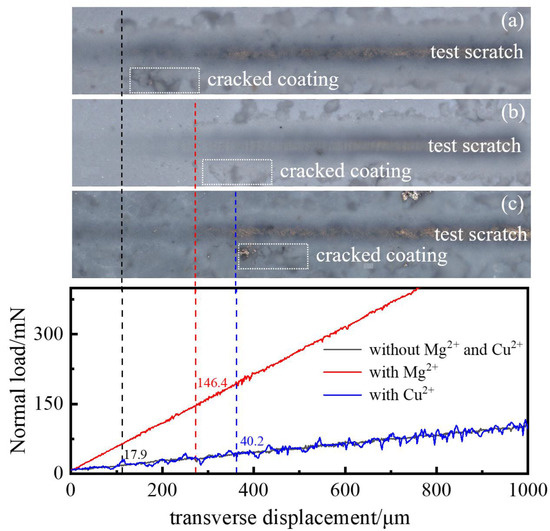 Scratch test results of EPD coating. (a) Without Mg2+ and Cu2+; (b) with Mg2+; (c) with Cu2+.