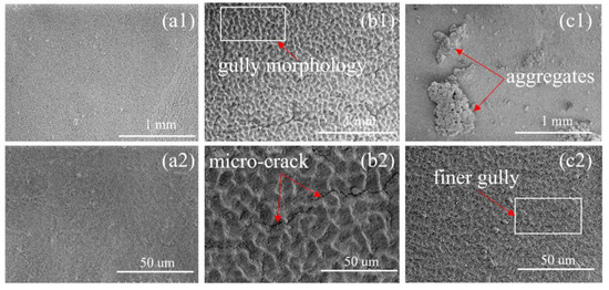Good coating adhesion can ensure the GBD result after EPD. To test it, we applied a linear normal load of transverse movement to the coating, and determined the coating adhesion according to the load when the coating cracked. Figure 8 shows the scratch test results of EPD coating. It was found that the critical load for cracking of the coating without a charging agent was 17.9 mN, but it increased to 146.4 mN and 40.2 mN when Mg2+ and Cu2+ were added, respectively, which indicates that the addition of Mg2+ and Cu2+ charging agents greatly improved the coating adhesion. Figure 9 shows the surface SEM morphologies of the EPD 90 s coated magnet. In Figure 9 (a1,a2,b1,b2), the coating surface with Mg2+ added showed regular gully morphology with distributed micro-cracks compared with the coating without a charging agent, which is profit for the release of stress [24]. As is seen in Figure 9 (c1,c2), the coating surface with Cu2+ added exists aggregates on the surface, and shows finer gully morphology, which may be the reason that the coating adhesion was between without charging agents and with Mg2+ charging agents.