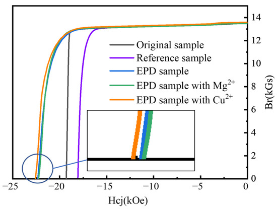 The addition of Mg2+ and Cu2+ can improve the EPD efficiency and the adhesion of the coating, but it cannot be at the expense of deteriorating the magnetic properties after heat treatment. A high-temperature permanent magnet measuring instrument (NIM-500C) was used to measure the magnetic properties of the permanent magnetic materials at room temperature and high temperatures, respectively. An external field of ~3 T was initially applied to make the samples magnetized at full saturation. The remanence (Br), coercivity (Hcj) and maximum magnetic energy product (BH)max of the magnet were obtained by testing the demagnetization curve of the material. Figure 10 shows the demagnetization curves of the magnet, where it can be seen that the coercivity (Hcj) of the original magnet was 19.3 kOe. With the first heat treatment process of 900 °C for 7 h, and the second heat treatment process of 500 °C for 2 h, the coercivity of the undeposited reference sample decreased to 18.1 kOe, while the coercivity of the EPD sample and EPD sample with Mg2+ and Cu2+ increased to 22.3 kOe, 22.2 kOe and 22.6 kOe, respectively. The remanence of all samples did not decrease. It indicates that the addition of Mg2+ and Cu2+ had no effect on the TbF3 coating GBD process. As an aside, the preparation of TbF3 coating containing copper has some development prospects, because Cu can promote GBD by widening the grain boundary [27].