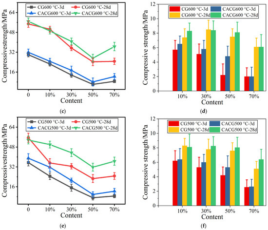 Strengths of mortars with calcined gangue and calcium-added gangue. (a) Compressive strength after 700 °C. (b) Flexural strength after 700 °C. (c) Compressive strength after 600 °C. (d) Flexural strength after 600 °C. (e) Compressive strength after 500 °C. (f) Flexural strength after 500 °C.