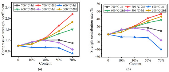 The specific strength coefficient and strength contribution rate of calcined pure coal gangue powders were calculated according to Formulas (1) to (3), and the results are illustrated in Figure 5.