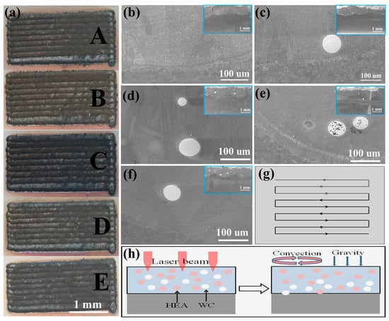 Figure 2 shows the surface and cross-sectional morphology of the laser cladding HEA/WC composite coatings. In Figure 2a, the surfaces of the cladding coatings are well formed on the 316L SS substrate without obvious pores or hot cracks. Figure 2b–f shows the cross-sectional morphology of the laser cladding samples A, B, C, D and E, respectively. It can be seen that the coating and the substrate are well connected, and the interfaces are flat and smooth with no pores or hot cracks. The metallurgical bonding is well formed. Figure 2g is the scanning path diagram of multi-track laser cladding. The morphology of the WC particles keeps its original spherical shape, and only a very small number of them are decomposed and melted, such as in Figure 2e. Figure 2h is a model of the laser interaction and coating solidification process. On the one hand, due to the influence of the convection effect, the WC particles and CoCrFeNi HEA powder melt to each other uniformly in the high-temperature molten pool. On the other hand, the density of WC particles is much higher than that of CoCrFeNi HEA powder, so most WC particles move to the bottom of the coating under the influence of gravity [26,27].