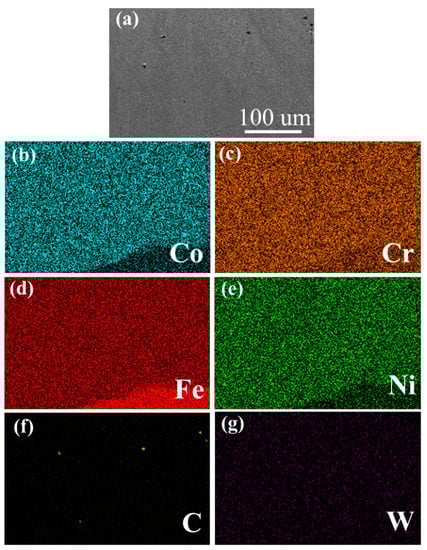 EDS mapping of CoCrFeNi HEA coating of sample A. (a) SEM of the CoCrFeNi HEA coating; (b) Co element distribution; (c) Cr element distribution; (d) Fe element distribution; (e) Ni element distribution; (f) C element distribution; (g) W element distribution.