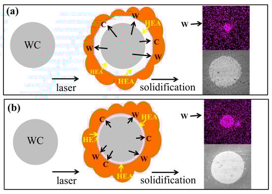 Xiao Q I et al. [31] divided the melting and decomposition of WC particles into three categories. According to the above analysis, it can be concluded that the situation in this experiment belongs to partial decomposition and slight decomposition. Figure 6a shows the schematic diagram of the decomposition and solidification of a partially decomposed WC particle. Under the interaction of the high-energy laser beam and high-temperature molten pool, the edge of incompact WC particles can be partially decomposed, then the melted part of the WC particles are injected into the molten pool. Under the action of the convection effect, as shown in Figure 2h, the decomposed WC particles diffuse into the molten pool to form new carbides. These carbides enter the microstructure, promoting the solid solution strengthening. In addition, the nucleation starts from the interface coating substrate, and spherical WC particles stop the growth of HEA grains, thus forming disordered refined grains. Figure 6b shows the slight decomposition and solidification mechanism of compact WC particles. The WC particles remain spherical, and the thermal action of the molten pool and laser beam is the physical mechanism of WC particle decomposition and solidification.