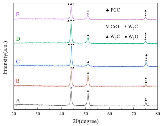 Figure 7 shows the phase composition of the CoCrFeNi HEA composite coatings fabricated using laser cladding. It can be seen that sample A only exhibits a single FCC phase (JCPDS: no. 33-0397; no. 33-0945; no. 34-0396), which is consistent with other research [32,33]. With the addition of WC particles, some carbides and oxides, such as W2C (JCPDS: no. 20-1315), W3C (JCPDS: no. 42-0853), W3O (JCPDS: no. 41-1230) and CrO (JCPDS: no. 08-0254), gradually appeared in the diffraction peak, which reveals that the WC particles melt and decompose. The formation of oxides may be based on the air mixed into the powders. However, there is no diffraction peak of WC in the XRD pattern, which may be due to the low content of WC, and some of it is decomposed and burned during laser cladding [34].