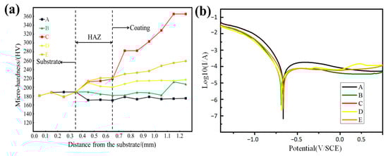 Mechanical properties of the HEA/WC coating. (a) The hardness distributions of HEA/WC composite coatings; (b) the potentiodynamic polarization evolution curves of HEA/WC composite coatings.