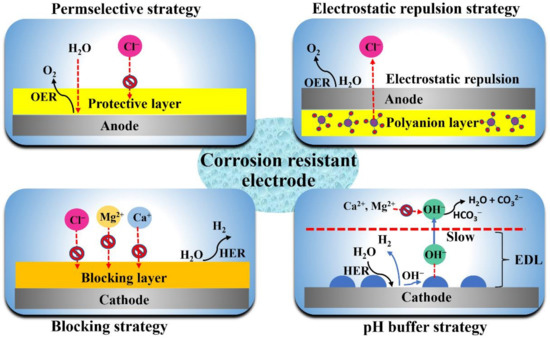 As mentioned above, the electrochemical reaction process of seawater electrolysis will cause side reactions due to various impurities in seawater, and, thus, disturb the seawater electrolysis process. One of the main challenges in seawater electrolysis is to avoid a CER, because a CER not only produces chlorine gas or hypochlorous acid that competes with the OER of the anode but also corrodes the electrode to reduce its stability and activity [80,81]. Therefore, corresponding design strategies, including coating a physical protection layer or using electrostatic repulsion to block or repel Cl−, are effective means.