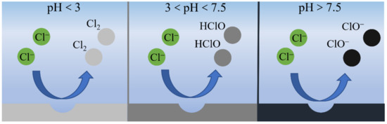 There are various kinds of ions in natural seawater, and Cl− is the main impurity ion. In the process of seawater electrolysis, a high concentration of Cl− will lead to the generation of impurities, such as chlorine or hypochlorite on the anode, which will seriously affect electrolytic activity [42,43,44]. Bennett et al. [45] discovered as early as 1980 that in the process of a cathodic HER with high current density, the anode will produce a large amount of chlorine to form a hypochlorite solution, which seriously affects the production efficiency of oxygen. In addition, Cl− has a very complex reaction process in the electrochemical process, which is influenced by pH value, potential and Cl− concentration. As shown in Figure 3, Strasser et al. [38] found that a CER tended to produce chlorine gas when the pH value of the anode was lower than three. When the pH is greater than 7.5, hypochlorite is more easily generated. As for the pH range of 3~7.5, hypochloric acid is the main product. The reactions in different electrolytes are shown in Equations (5)–(7) [39,46,47,48].