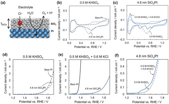 Amar et al. [97] prepared a nanoscale ultra-thin silicon oxide (SiOx) inert layer deposited on a planar Pt thin film electrode using photochemical technology to reject the transport of Cl− and prevent the occurrence of a CER (Figure 4a). To understand the ability of a covering layer for inhibiting a CER, a series of electrochemical tests were conducted. As shown in Figure 4b, the Hupd signal for a 4.8 nm SiOx|Pt electrode is only 4% lower than the signal for an electrode made of bare Pt, indicating that the Pt surface at the buried interface between Pt and SiOx has the catalytic activity. Compared with bare Pt, the response of the presence of Cl− on a 4.8 nm SiOx|Pt electrode is quite different (Figure 4c). As shown in Figure 4d, the starting potential of an OER on a 4.8 nm SiOx|Pt and a bare Pt electrode is almost the same in chlorine-free supported electrolyte at an acidic pH. In the presence of 0.6 M Cl−, the initial potential of a CER on bare Pt was 270 mV lower than that of an OER in the supported electrolyte (Figure 4e). In the 0.6 M KCl + 0.5 M KHSO4 supported electrolyte, a 4.8 nm SiOx|Pt electrode had almost no CER oxidation peak at 1.35 V, indicating that the SiOx coating hindered the transmission of Cl− (Figure 4f). The above results indicated that the inert layer could effectively inhibit a CER by hindering the transfer of Cl− to the electrode’s buried interface, while permitting the required an OER to occur there. Finally, by optimizing the structure of the SiOx layer, researchers added fixed anionic charges to the electrostatic repulsion of Cl− to further improve the chlorine resistance of the SiOx coating.