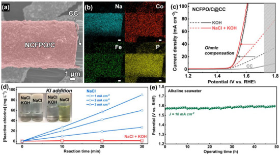 In addition, a carbon layer can also be used as the protective layer to promote the stability and corrosion resistance of the electrode. Hee et al. [82] developed carbon coated cobalt sodium pyrophosphate nanoparticles (NCFPO/CNPs) via a series of heat treatment methods. It was shown that NCFPO/CNPs were evenly coated on the carbon cloth surface (Figure 5a,b). As shown in Figure 5c, OER activities of NCFPO/C@CC in 0.1 M KOH and 0.5 M NaCl + 0.1 M KOH electrolytes were similar, demonstrating that Cl− had little influence on the electrocatalytic performance. To further prove the ability of an electrode to inhibit a CER in an alkaline saline solution, iodide titration was used to determine whether there was active chlorine. In fact, the color changed in an NaCl solution, but not in an NaCl+KOH solution (Figure 5d). This showed that the electrode did not produce active chlorine in the alkaline saline solution, which effectively inhibited a CER. In the process of an OER, the hydroxide evolved on the surface of the NCFPO/C NPs acted as the active site of oxygen generation, which improved the catalytic activity of an OER. Moreover, the carbon layer coated on the electrode surface could effectively isolate the corrosive Cl− in the seawater, so that active chlorine was not produced, which led to electrode corrosion. In the constant current stability test, the required voltage did not change basically, demonstrating the electrode’s stability (Figure 5e).