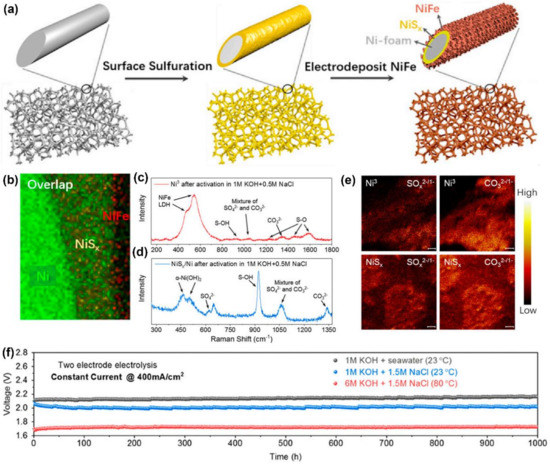 Kuang et al. [83] developed a low-cost electrode (NiFe/NiSx-Ni foam) for seawater electrolysis without chloride corrosion. The NiSx covering layer on Ni foam was synthesized by a solvothermal process. Then, NiFe hydroxide was electrodeposited by reducing the nitrate from a mixed solution of nickel and iron nitrate (Figure 6a). The image of cross-section element mapping showed that a NiSx layer (about 1 to 2 μm) was coated on the Ni foam, and a NiFe layer (about 200 nm thick) was formed on the NiSx layer (Figure 6b). After anodic activation, about 0.3 V overpotential was added to the NiFe/NiSx-Ni foam anode to reach 400 mA cm−2 in an alkaline simulated seawater electrolyte, which was much lower than that used for the oxidation of chloride to hypochlorite (0.49 V). Stability tests showed that the introduction of a NiSx polyanion layer could greatly improve the ability to resist chlorine corrosion. Raman spectroscopy revealed that the activation/passivation treatment of NiFe/NiSx-Ni foam resulted in transient etching; consequently, the polyanions were passivated through the layer of the anode (Figure 6c,d). The excellent OER performance and corrosion resistance of NiFe/NiSx-Ni foam to Cl− was derived from the sulfate and carbonate intercalated NiFe hydroxide catalyst layer and the underlying sulfate-rich anodized NiSx layer. The activated/passivated NiFe/NiSx-Ni foam anode was assembled with an active HER cathode (Ni-NiO-Cr2O3) to form a two-electrode alkaline seawater electrolyzer. This seawater electrolyzer could operate stably under high temperatures and concentrated base conditions (typically used in industry), only needing 1.72 V to achieve 400 mA cm−2 in 6 M KOH + 1.5 M NaCl at 80 °C for over 1000 h (Figure 6e,f).