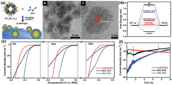 Utilizing polyoxometalate (Co16Mo16P24) and dicyandiamide (DCA) as precursor, Ma et al. [77] fabricated CoMoP nanocrystals covered by a small amount of N-doped carbon shells (CoMoP@C) by pyrolysis under a nitrogen atmosphere at 800 °C (Figure 8a). Using a transmission electron microscope, it was observed that the morphology structure of CoMoP@C exhibited a typical core-shell structure (Figure 8b,c). The CoMoP was wrapped with several layers of graphite carbon, which could effectively prevent the corrosion of harmful ions. The doping of N increased the electron density in the graphite carbon shell and enhanced the HER activity, as confirmed by a density functional theory calculation (Figure 8d). In the actual seawater test, researchers found that the performance of CoMoP@C decreased by less than 5% after 20 cycles, while that of Pt/C rapidly decreased by 40% (Figure 8e). To further study the impact of N-doped carbon shells on stability, the i-t testing of CoMoP NPs and CoMoP@C in seawater electrolysis was tested (Figure 8f). The results indicated that the CoMoP@C remained stable for 10 h without any change in current density. In the absence of N-doped carbon shell protection, the current density of CoMoP NPs decreased by more than 75% within 3 h. The above series of experiments showed that the remarkable stability of the catalyst was attributed to the carbon layer, protecting the catalyst from toxicity and corrosion during seawater electrolysis.