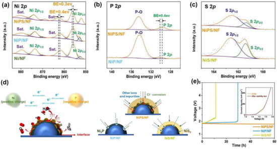 XPS spectra of samples for (a) Ni 2p, (b) P 2p and (c) S 2p. (d) Illustration of intensive performance of NiPS/NF for water electrolysis. (e) Long-term stability of samples at 200 mA cm−2. Reproduced with permission. Ref. [87] Copyright 2022, Elsevier.