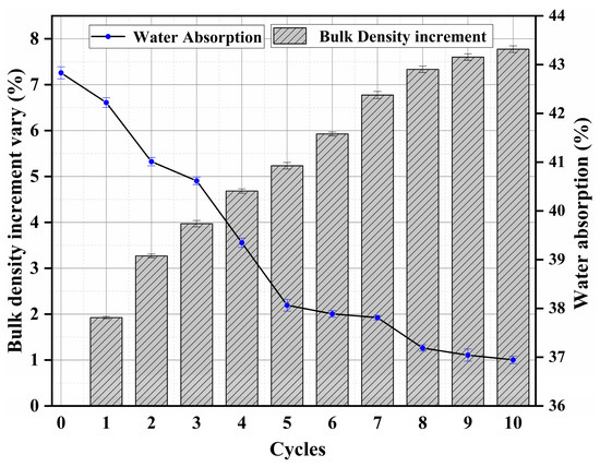 Water absorption and bulk density increment vary with the number of cycles of treatment.