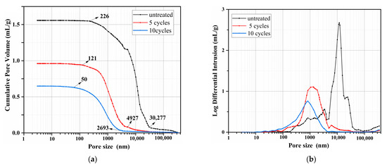 Figure 5 compares the pore size distribution of untreated and treated wood. It can be seen from Figure 5a that the pore diameter of untreated wood is mainly distributed from 226 nm to 30,277 nm. After five cycles of treatment, the pore diameter of wood is mainly distributed in the pore size of 121 nm to 4928 nm, suggesting that large numbers of pores and blowholes are filled with precipitate as confirmed by SEM analysis. The pore diameter of 10 cycles of treated wood is mainly distributed in the pore sizes of 50 nm to 2693 nm, which attributes to more precipitate deposition. As shown in Figure 5b, the pore diameter of untreated wood is concentrated between 5000 nm (5 μm) and 40,000 nm (40 μm), which is caused by pores and blowholes in wood. Those pores and blowholes are converted to the small aperture as indicated by Figure 5b. The pore diameter of five cycles of treated wood is concentrated between 200 nm (0.2 μm) and 5000 nm (5 μm), and 10 cycles of treated wood is concentrated between 100 nm (0.1 μm) and 3000 nm (3 μm). The SEM analysis, XRD analysis, and MIP test show that phosphate precipitations are deposited on the surface of the wood and in the connecting pores on the surface, resulting in the reduction of wood porosity. Moreover, porosity decreases with the increase in cycle times. The cumulative pore volume of 10 cycles of treated wood is decreased by 54.3% compared to the untreated one, indicating the good potential of the proposed treatment method.