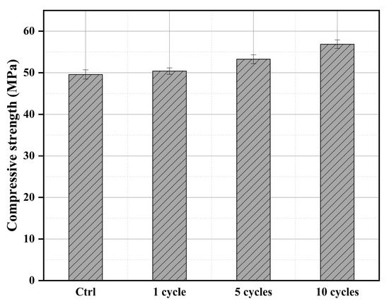 The compressive strength of different cycles of treated wood is shown in Figure 6. It can be seen that the compressive strength of untreated wood can reach 49.6 MPa, which is consistent with previous research [39]. The compressive strength of the treated wood has increased to a certain extent, of which the strength of the recycled wood is basically the same as that of the untreated wood. This is mainly due to the small number of impregnations and the less phosphate deposited on the surface of the wood, which has also been confirmed in SEM analysis. The strength of the wood after five cycles increased by 7.38% compared with that of the untreated wood. This is due to the more phosphate deposited on the wood, which leads to the more encrypted structure of the wood pore. The compressive strength of wood treated in 10 cycles has increased by 14.7% compared to the untreated wood. It can be seen that with the increase in the number of cycle treatments, the impregnation efficiency has increased significantly. It has also been shown in detail in the SEM and MIP analysis.