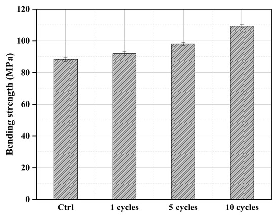 The bending strengths of the wood at different cycles treated are shown in Figure 7. The bending strength of untreated wood is 88.2 MPa. It is basically consistent with the wood performance research parameters made by Atar [40]. The results show that the bending strength of the wood after one cycle treated is only 5.25% higher than that of the untreated wood. After five cycles of treatment, the bending strength of the wood increased by 11.2% compared to the untreated wood. It can be seen that multiple cycles can enhance the bending strength of the wood, which is mainly caused by the phosphate deposited on the wood, improving the wood pore structure, and making the wood more encrypted. This has been confirmed in the SEM and MIP tests. The bending strength of the treated wood after 10 cycles has been improved by nearly one step, which can reach 23.8%. This is mainly due to the increase of phosphate deposited on the wood and the improvement of the bending resistance of the wood.