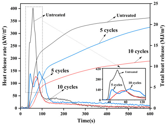 Heat release rate (HRR) and total heat release (THR) are usually used to measure the refractory performance of materials [41,42]. The higher HRR and THR indicate a high, intense, pyrolysis of the material, which is harmful to the burning wood and the environment [43,44]. Figure 8 shows the heat release rate (HRR) and total heat release (TRR) curves of different cycle-impregnated wood. It can be seen that the HRR curves of untreated wood have two heat release peaks. When the wood sample is ignited, it starts to burn and release heat, which is the reason for the presence of the first heat release peak. A carbon layer is formed on the surface of the wood sample. The carbon layer acts as a physical barrier, which can prevent heat and oxygen from penetrating into the sample [45,46,47]. However, due to the high porosity of the untreated wood sample, the carbon layer has no obvious barrier effect on the air. This leads to rapid internal combustion and a second heat release peak. As shown in Figure 8, the wood did not tend to stabilize after the first heat release peak and quickly rose to the second heat release peak. Those two heat release peaks also appeared in the five cycles of treated wood. However, these two peaks are smaller than the untreated sample. Up to 47.3% and 63.3% reductions in the first peak and second peak can be achieved by the five cycles of treatment. Meanwhile, the heat release peak can be significantly delayed after five cycles of treatment, as shown in Figure 8, leading to better performance of flame retardancy. This is attributed to two reasons: (one) the sample of five cycles-treated wood has a dense microstructure, which can effectively prevent heat and oxygen from entering the sample with the carbon layer; (two) phosphate precipitates deposited on the wood are good flame-retardant materials. These precipitates not only have good thermal stability, they also absorb a lot of heat during the separation of bound water. It has also been proven to be a flame retardant in previous studies [48]. The total heat release of the five-cycles-treated wood is decreased by 7.8% compared to the untreated one. The HRR curve of wood with 10 cycles of treatment has only one peak with 127.8 kW/m2. Moreover, this sample did not release heat in the first 41 s, indicating that the wood did not start to burn during this period. More importantly, the heat release rate is slow after 71 s, suggesting that the treated wood has excellent flame retardancy. This is attributed to two reasons: (one) more phosphate deposits make the wood surface more difficult to ignite; (two) the dense carbon layer can block the internal combustion, leading to the significant reduction of heat release peak. Since the excellent flame retardancy, the total heat release of the 10-cycles-treated wood was reduced by 48.7% compared to the untreated wood.
