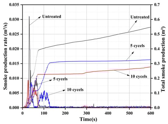 The smoke production rate (SPR) and the total smoke production (TSP) are the main parameters to evaluate the fire safety performance of the materials [49]. The results of SPR and TSP are shown in Figure 9. Clearly, all samples have two smoke production emission peaks. For the untreated wood, the maximum SPR of the first peak is reached 0.0311 m2/s at 31 s, which is higher than other treated samples. After the initial ignition and combustion test, the wood is immediately pyrolyzed, which is mainly carried out on the surface of the wood. The wood is gradually decomposed into small molecular combustible gases, such as tar and coke. The pyrolysis process absorbs part of the heat, which results in less heat energy on the wood surface and more noncombustible volatiles, and incompletely oxidized organics [50,51]. This is the main reason for the rapid increase in the smoke production rate from untreated wood in this short period of time. After the cycle treatment, phosphate deposits are deposited on the surface of the wood, which inhibits the decomposition of the wood into small combustible gases to a certain extent. These phosphate precipitates have a protective effect on the wood, resulting in lower smoke emissions. The test results show that the first peak of the five-cycles-treated wood is reduced by 72.3% compared to the untreated wood. As the combustion continues, the surface temperature of the wood continues to increase, and the combustion begins to proceed inward. Since combustion is a very violent physicochemical reaction, the ashes burned on the surface of the wood can volatilize into the air. Some of the unoxidized small particles produced by insufficient combustion will be released with heat dissipation [52]. This is the main reason for the second peak of SPR. For the five-cycles-treated wood, the carbon layer formed is denser because the wood is catalyzed into a carbon better, leading to the adsorption of more smoke and volatile small particles. With the increase of cycles treatment, some phosphate can be deposited inside the wood, which hinders the combustion inside the wood. After 10 cycles of treatment, the second smoke emission peak of the combustion process is significantly reduced compared to the untreated wood lower than that of the control group. However, the second smoke emission peak of the wood treated with 10 cycles is slightly higher than that of the samples treated with five cycles. This is due to the decomposition of phosphates inside the wood, resulting in the formation of small volatile particles [53]. Since combustion is hindered by the presence of phosphates, the TSP of the treated wood is significantly reduced, as shown in Figure 8. The results showed that the TSP of wood after 5 and 10 cycles of treatment is 42.9% and 54.2% lower than that of the untreated wood, respectively. Compared with previous relevant research [54], the results of SPR and TSP indicate that the fire safety of the wood can be significantly improved by the proposed treatment method.