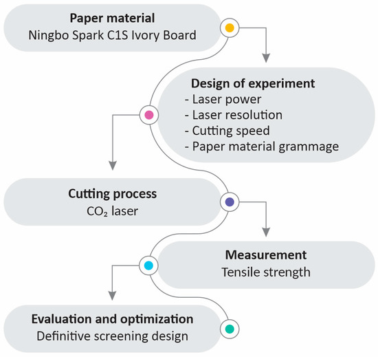 Although invented in 1960 [1], laser technology is still considered to be a new innovative tool in manufacturing industries, and the conventional manufacturing methods remain present and widely used. As a widespread technology with distinguish efficiency and accuracy, as well as a promising future, laser cutting has been extensively applied in the cutting of various materials: wood-based materials [2,3], concrete [4], cement-based materials [5,6], polymeric materials, such as polymethyl methacrylate [7,8,9], polypropylene [8], and polystyrene [10], as well as various metallic materials: stainless steel [11,12,13,14,15,16], carbon steel [17], aluminum alloy [17], and metallic plates [18]. The first use of the laser in the paper industry dates back to the 1970s, when laser was introduced for perforating cigarette paper, cutting paper, and paperboard [19]. With this development, laser technology showed considerably good results and characteristics for use in the graphic industry start to replace conventional machines over time. Additionally, laser technology enabled the development and invention of new printing techniques (laser printers) and broadened the possibilities of this industry [20]. Aside from printing, laser technology usage is increasing in postpress. Postpress (finishing) is an important and time-consuming part of the graphic industry. The use of lasers in postpress production fits perfectly into the digital print workflow. There are also material and packaging industries in which lasers completely replace mechanical blades, and lasers have become an integral part of the specific printing machines (in-line systems). The packaging industry benefited greatly regarding the quality of the laser cut during the interaction with paper material. The paper material and the number of non-metallic materials, such as glass, plastic, rubber, wood, textile, etc., are suitable for cutting with a CO2 laser. These materials are a big part of the packaging industry, used as the raw material or for the final product. Researchers showed several differences in comparison with conventional cutting methods and the benefits of cutting paper materials using CO2 laser [19,21,22]: no need to change tools if cutting different geometry and patterns, contact-free method, higher cutting speed, smaller amounts of dust, and reduced material lost.