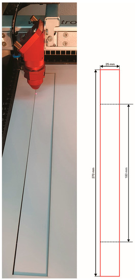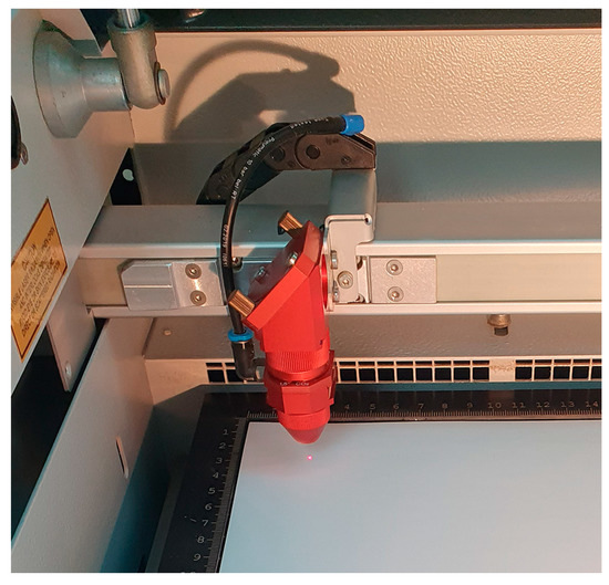 Samples were cut using Trotec Speedy 300 (Trotec, Marchtrenk, Austria), CO2 laser (Figure 2), with power 80 W and maximum cutting speed 3.55 m/s, which produces a laser beam with a wavelength of 10.6 µm. The laser is equipped with a 1.5-inch lens, and it can be used for cutting, engraving, and marking. Movement on the laser head is possible in XY direction controlled by software JobControl Laser Software (v 11.1.1). The software enables total control over the laser device, including head position, the focus of the beam, and all other parameters. The Trotec Speedy 300 device was equipped with suction, which removes fumes produced during laser beam and material interaction. The cutting operation can be done with paper materials, acrylic < 6 mm thick, and wood < 8 mm thick. Utilizing the managing software JobControl®, it is possible to program the parameters for the job and choose adequate material.