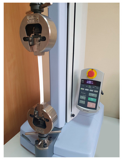 Tensile strength testing was conducted using Shimadzu Compact Tabletop Testing EZ-LX (Shimadzu, Kyoto, Japan), (Figure 4). Specimens were tested utilizing the load cell type of 2.5 kN and a crosshead speed of 25 ± 5 mm/min.