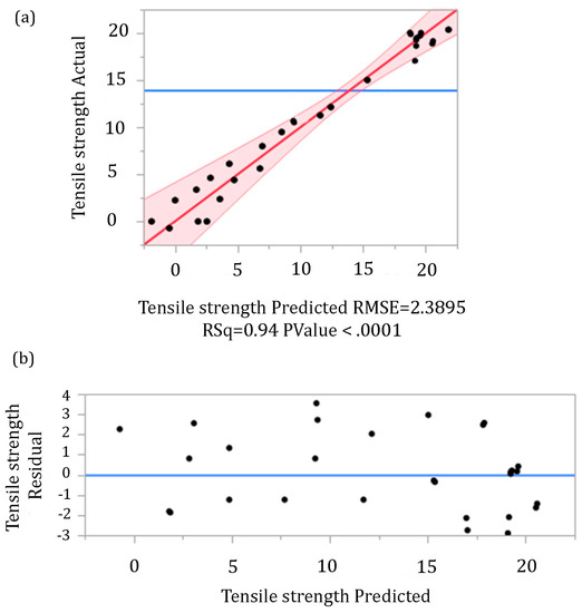 Additional testing of the adopted model adequacy was conducted using diagnostic plots (Figure 5). A scatter plot of actual vs. predicted tensile strength values (Figure 5a) shows that the points closely follow the regressed diagonal line without outliers. On a deviation diagram of standardized residuals, there is no tendency for value scattering, and dots are randomized in space, implying that the regression model has a good representation of the investigated model (Figure 5b).