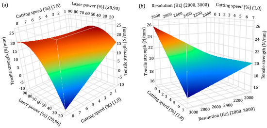 Figure 6b illustrates significant two-way interaction between cutting speed and laser resolution. At the constant high laser resolution values, tensile strength increases with a decrease in cutting speed. It can be concluded that the influence of resolution on the increasing tensile strength is greater when the resolution value is set and held constant at 3000 Hz.